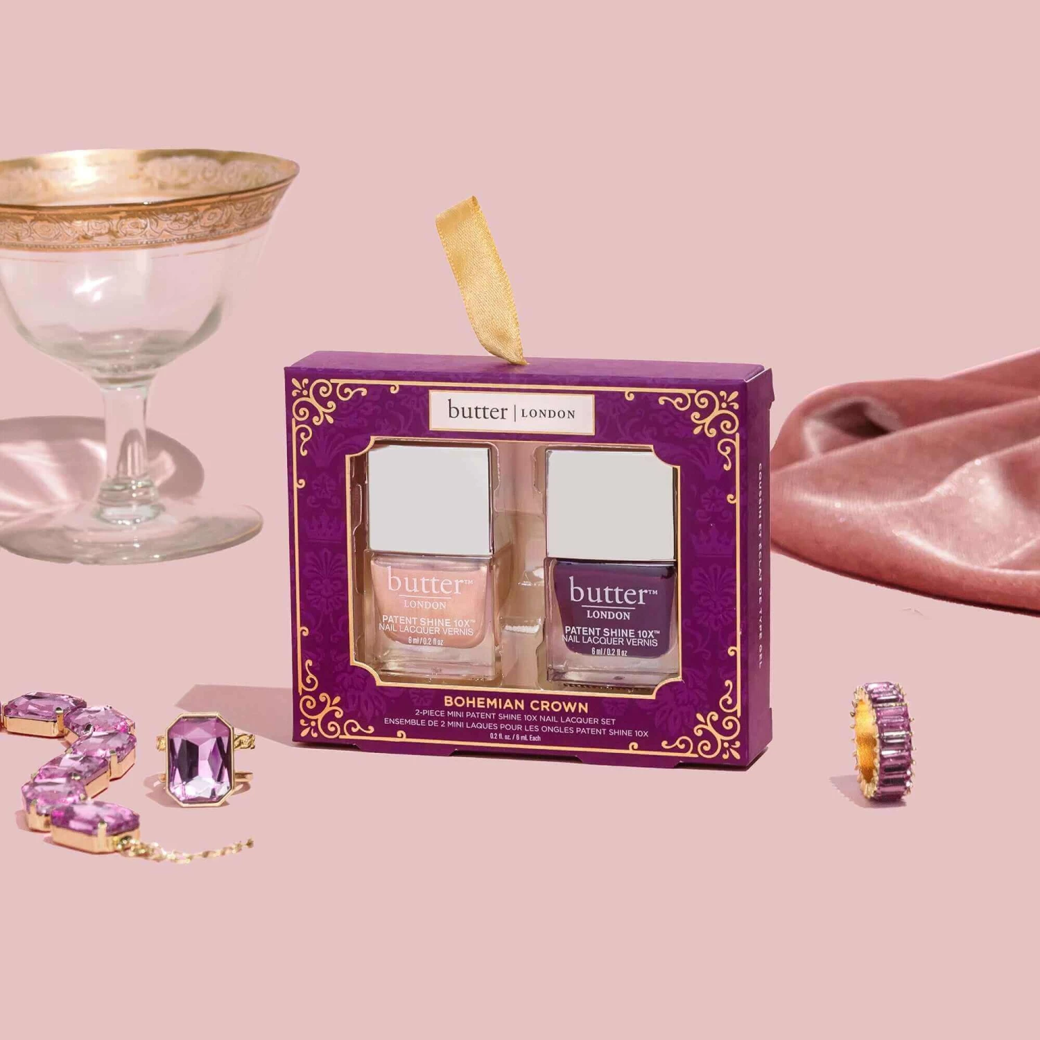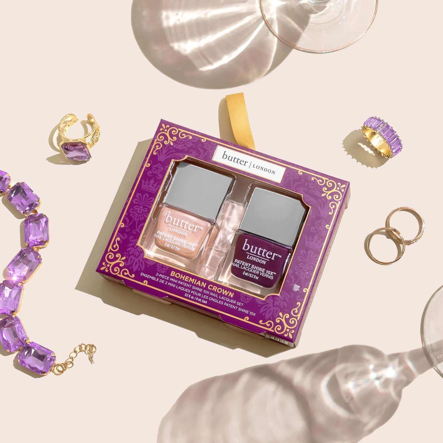 Embody the glamorous high stakes of the royal family with this jewel-toned 2-Piece Mini Patent Shine 10X Nail Lacquer Set. Named after the oldest surviving royal crown made up of 12 gothic hexagonal rosettes, Bohemian Crown features Champagne Princess, an indulgent pearlescent champagne hue and Afters, a mysterious dark blackberry crème. Our signature Patent Shine 10X good-for-you nail formula is proven to promote brighter, stronger, healthier-looking nails. The patented Shock Resisting Polymer Technology delivers a gel-like finish and undeniable shine with up to 10 days of wear.Â